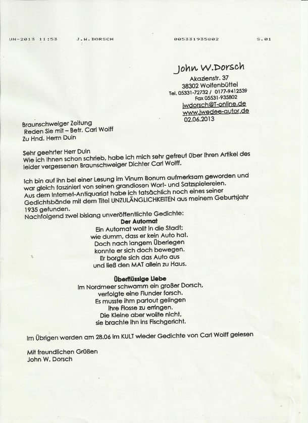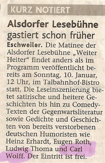Zusätzlich kann ich noch berichten,das die Alsdorfer Lesebühne ab Herbst 2009 unter dem Programmpunkt-Heiter weiter-einige Gedichte von Carl Wolff in ihr Vortragsprogramm aufnimmt.Einzusehen unter www.alsdorfer-lesebuehne.de