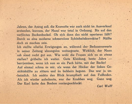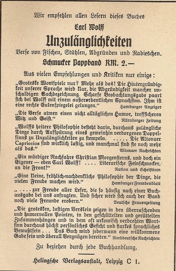 "Um der Kuriosität willen sei noch mitgeteilt,daß in den letzten Jahrzehnten wohl kein Autor so eifrig bestohlen wurde wie der bald nach seiner Entdeckung(im Hamburger "Bronzekeller") verstorbene Außenseiter Carl Wolff.Ansager,Humoristen und Lautensänger betrachteten seine knappen,witzigen,fast immer trefflich pointierten Verse als willkommene Beute."