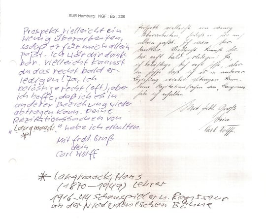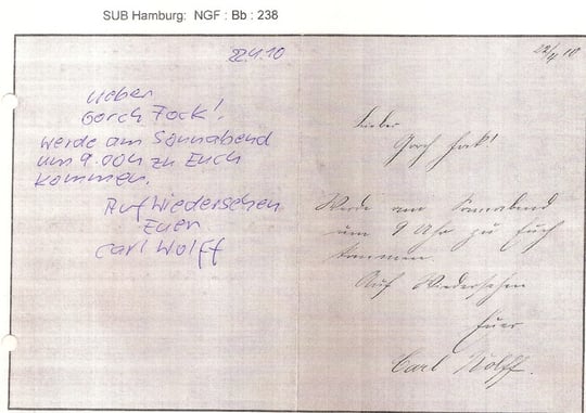 Zwischen beiden muss ja eine Freundschaft bestanden haben,auch auf familiärer Basis.Wobei Gorch Fock zur damaligen Zeit schon eine absolute Grösse als Schriftsteller in Deutschland war.Carl Wolff hat sich damals kulturell engagiert,