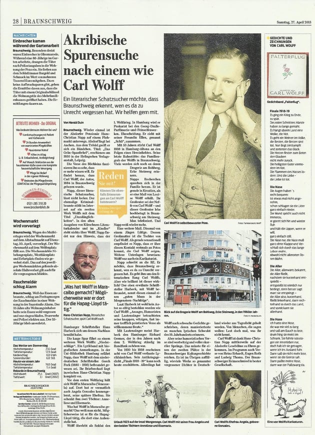 Mit dem Fund eines kleinen Büchleins vor 3 Jahren auf einem Trödelmarkt begann für mich eine lange und noch andauernde fast detektivische Literaturrecherche,die immer noch hoch spannend ist.Der Grund war ein schmales Bändchen von Carl Wolff mit dem skurrilen Titel "Das Grün-Spanferkel" Verse von Magneten,Pusteblumen und Kakerlaken,aufgelegt von der Helingschen Verlagsanstalt Leipzig in den 30-iger Jahren des vorigen Jahrhunderts.Von einem Carl Wolff hatte ich noch nie etwas gehört und die Verse des Büchleins faszinierten mich,also begann die Suche.Internet so gut wie Fehlmeldung.Ich fand nur noch einen weiteren Lyrikband mit dem Titel"UNZULÄNGLICHKEITEN".Biografische Angaben waren wiederum nicht zu erlangen.Auch eine Suche in einer Vielzahl von literarischen Nachschlagewerke ,wie alte Ausgaben von Kürschners Literaturkalender und dem Kindler blieben erfolglos.Es gab nur einen Hinweis auf den Schriftsteller Hans Harbeck,der sich um den Nachlass von Carl Wolff bemüht hat.Schliesslich konnte ich das Buch" Niederschläge" erwerben,in welchem sich erste biografische Daten fanden,die aber immer noch grössere Lücken aufwiesen.Eine weitere Recherche in der Unibibliothek Hamburg ergab,das Wolff dem bekannten niederdeutschen Schriftsteller Gorch Fock eng verbunden war.Zwischen beiden gab es vor dem 1.Weltkrieg einen Briefwechsel,der mir komplett vorliegt.Zum Inhalt des Briefwechsels sind Aussagen in meinem Artikel auf der Internetplattform www.buecher-wiki.de über Carl Wolff getroffen.Weiter konnte ich recherchieren,das er vor dem 1.Weltkrieg in Venezuela und zwar in Maracaibo tätig war.Dort hat er vermutlich auch seine Frau, eine Spanierin ,kennengelernt.Was er in Venezuela beruflich gemacht hat und für welche Firma liegt im Dunklem,möglicherweise für die Hapag-Lloyd,die dort eine Aussenstelle hatte.Zum ersten Weltkrieg ist bekannt,das er Soldat gewesen sein muss.Dies geht aus Gedichten von ihm hervor und zwar im Jahre 1918 im Elsass im Sundgau.Für die 20-iger Jahre gibt es ausser seinen Gedichtbänden keine Aussagen zum Lebensweg.Über seine Familie gibt es ebenfalls keine Hinweise.Er ist ja relativ jung gestorben,mit 53 Jahren.Über Todesursache und Begräbnisort,sowie Verbleib seiner Frau und der 2 Töchter konnte ich bis dato noch nichts in Erfahrung bringen.In einem Telefonbuch von Hamburg aus dem Jahre 1934 taucht ein Carl Wolff als Prokurist auf,was stimmig mit seinem kaufmännischen Beruf wäre.Der Familienname Wolff tritt sehr häufig bei Personen mit jüdischem Glauben auf,ob er dieser Glaubensgemeinschaft angehörte ,ist ebenfalls nicht nachweisbar.Ein Bild oder Foto von Carl Wolff konnte ich ebenfalls noch nicht finden.Weitere Recherchen meinerseits laufen noch,da ja,wie geschrieben,noch viele Fragen offen sind.