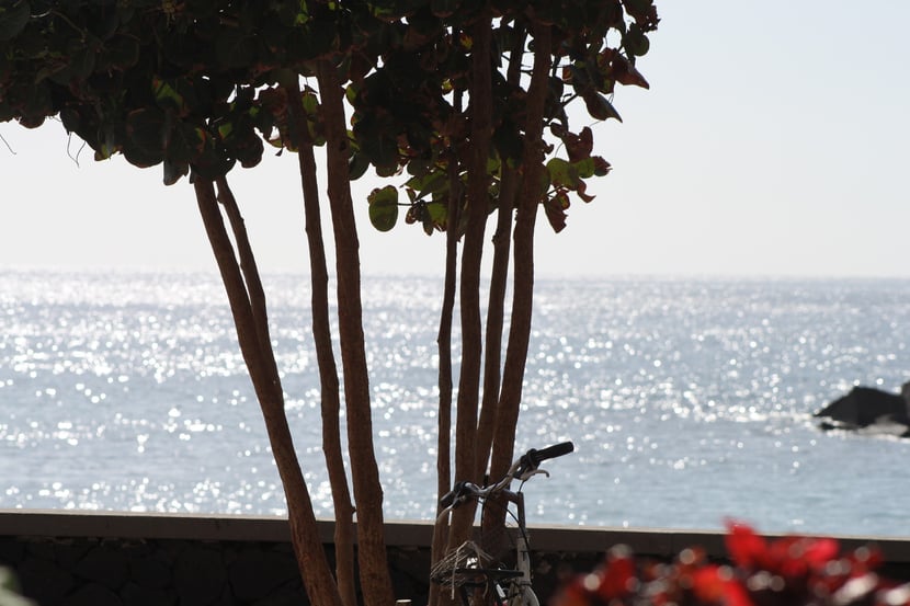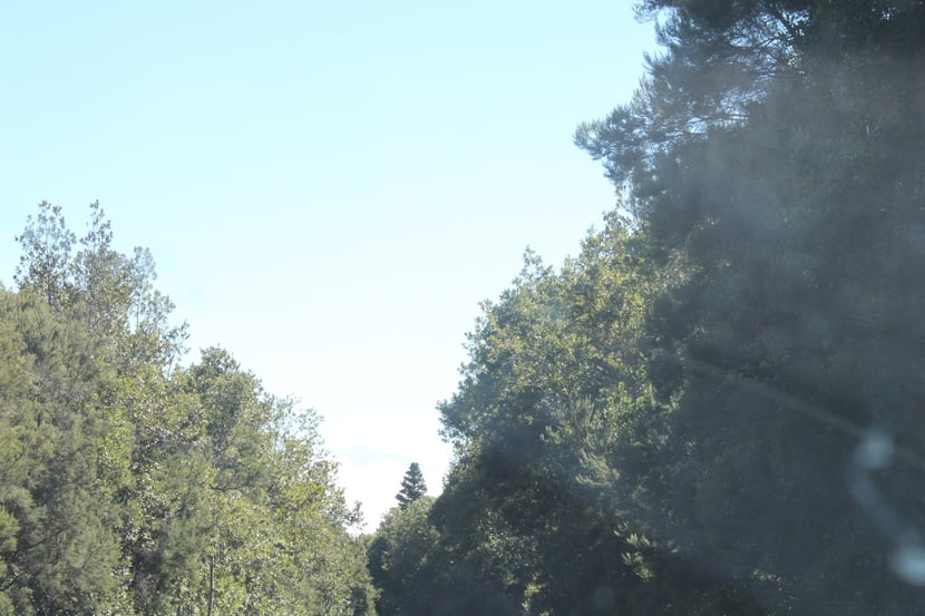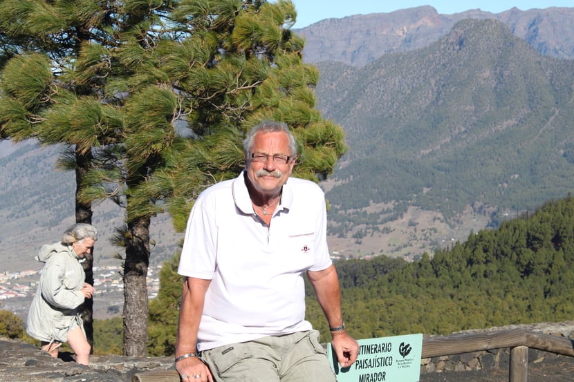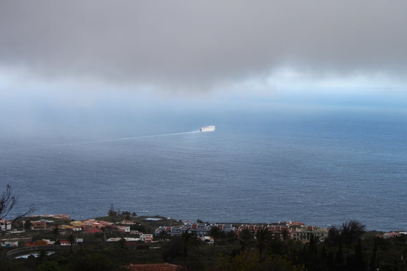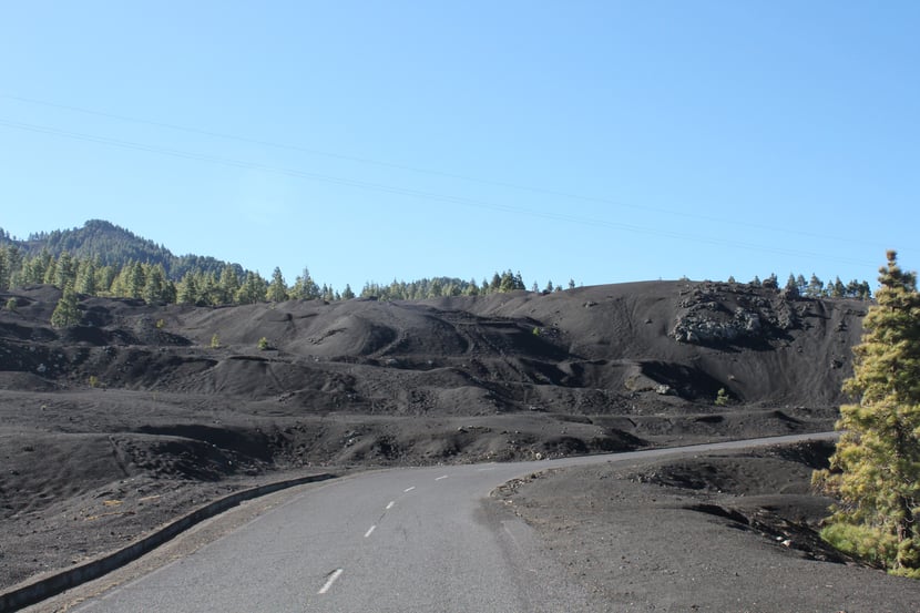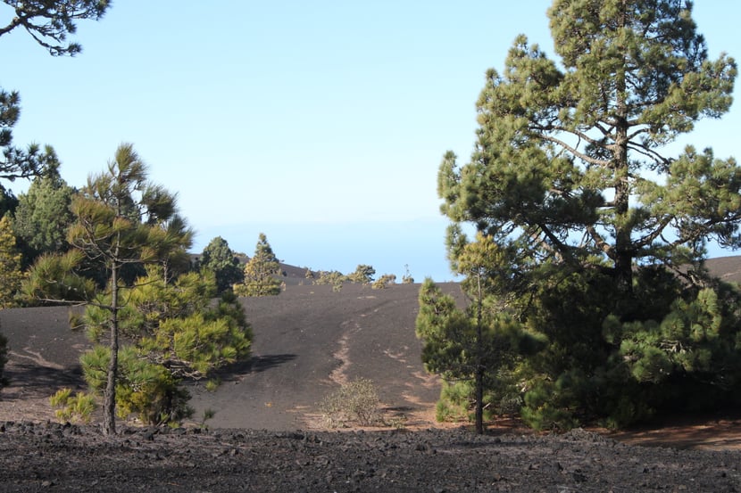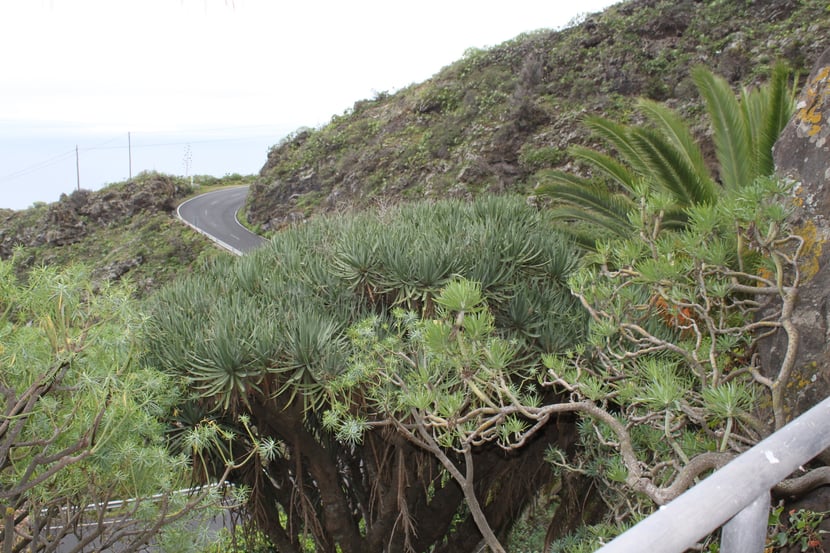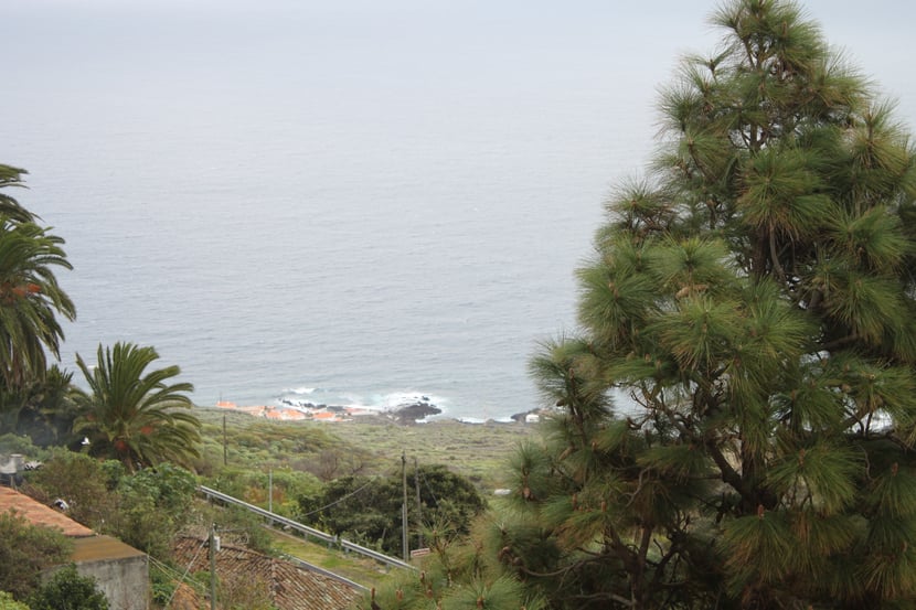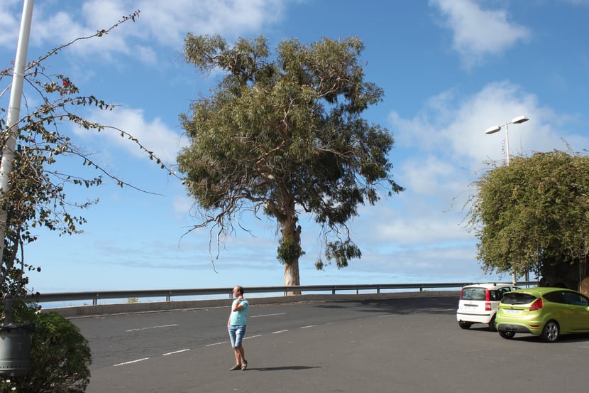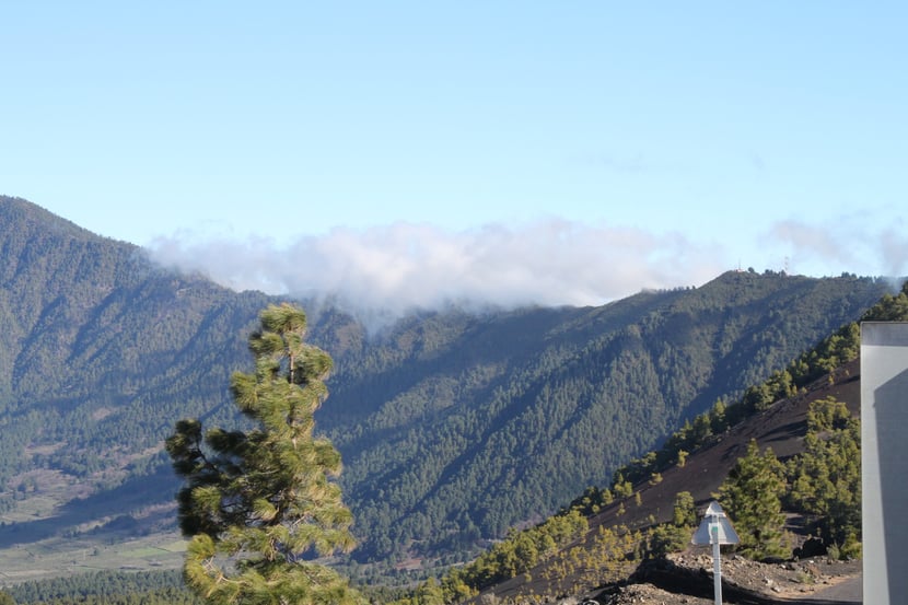 Abfahrt vom El Pilar zur Ostküste, zwischen den Bäumen ist der Pico de Teide auf Teneriffa zu