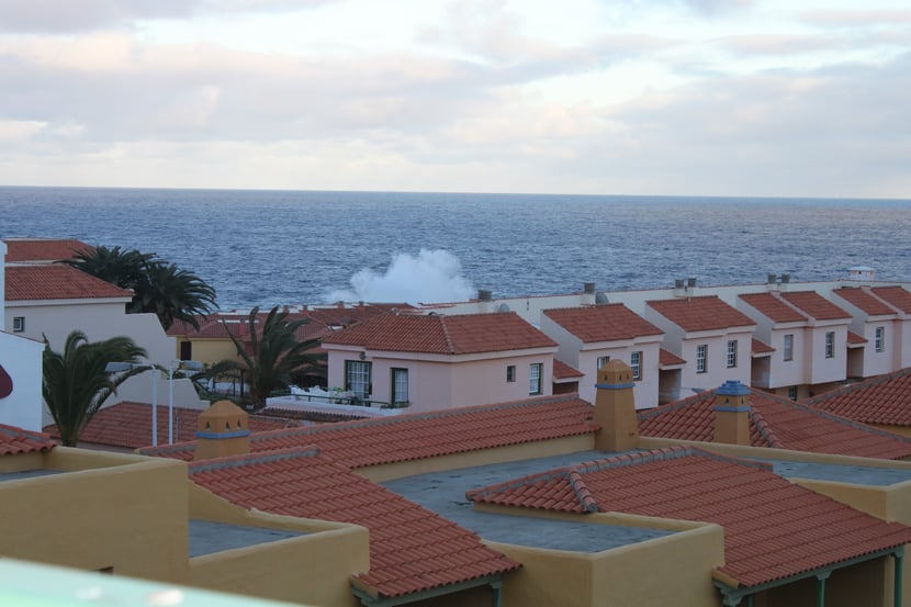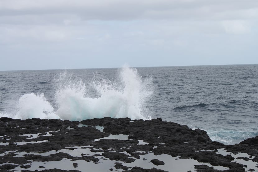 Das ist keine Explosion, so hoch schlägt die Gischt an der Küste in den Lavabuchten bei bewegter See.