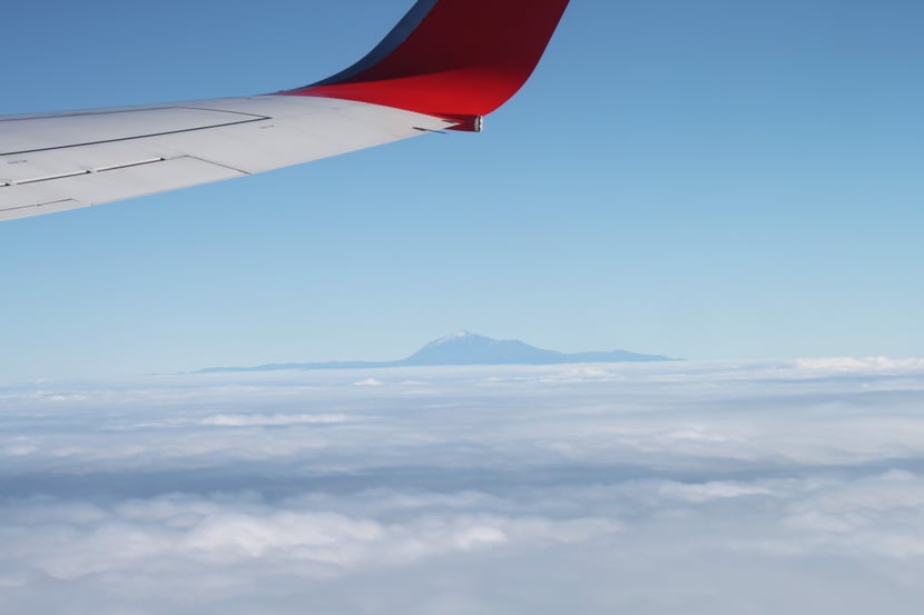 Der Pico de Teide mit schneebedecktem Gipfel aus dem Flugzeug.
