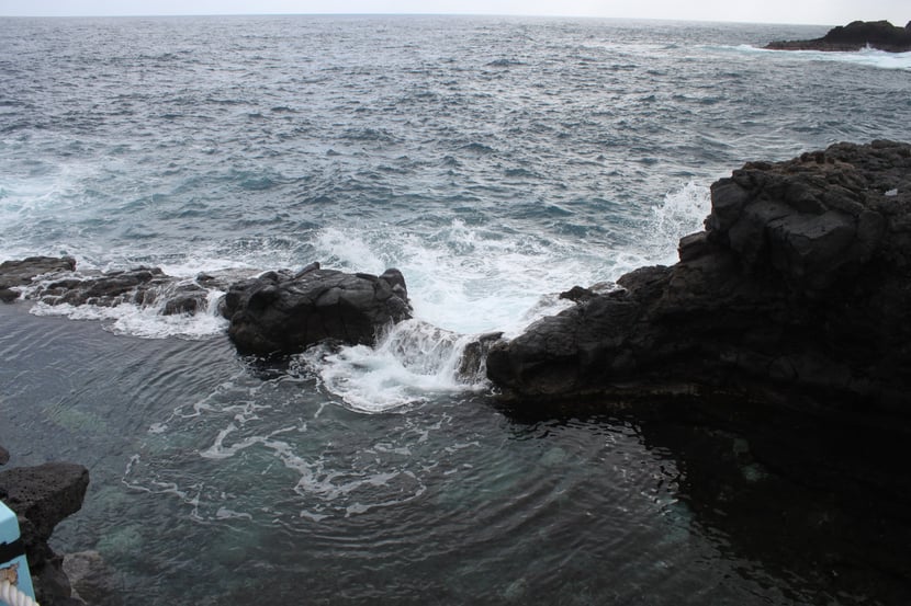 Das Meeresschwimmbecken von Charco Azul bei San Andres. Durch den Wellenschlag wird es ständig mit Frischwasser aufgefüllt und an der linken Seite fließt das Wasser über den Gesteinsrand wieder ab. Faszinierend.