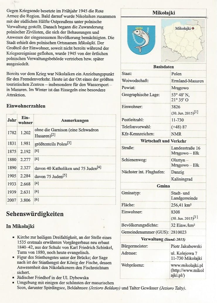 Ein wunderschöner Ort an einer Seenplatte,dem Nikolaikensee mit einer Verbindung zum größten See Polens, dem Jezioro Sniardwy, früher Spirdingsee. Wir haben natürlich eine Bootsfahrt auf beiden Seen gemacht. Bekannt ist der Nikolaikensee durch die Sage über den Stinthengst, der auch das Wahrzeichen in Denkmalform von Nikolaiken ist.Der Inhalt der Sage ist im Wikibeitrag nachzulesen.